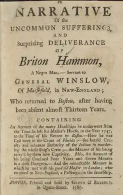 Briton Hammon was a slave of African descent who lived in British North America during the middle of the 18th century. On December 25, 1747, by leave of his owner, Hammon left his home in Marshfield, Massachusetts, to board a ship in neighboring Plymouth to work on a sailing ship headed for Jamaica. On June 15, 1748, the ship wrecked. Hammon and the crew were cast away off the coast of Florida, beginning a series of hardships and adventures that he chronicled in an autobiographical account, A Narrative of the Uncommon Sufferings, and Surprizing [sic] Deliverance of Briton Hammon, A Negro Man, first published in 1760. His experiences after the shipwreck included being held captive by the indigenous peoples of Florida, spending four years in a Spanish prison in Cuba, being rescued by a British lieutenant who smuggled him on board a British man-o-war, and then serving several years in the British Navy before suffering wounds during a skirmish with a French warship. Hammon was honorably discharged from the Royal Navy and recounted reuniting with his owner in London, England. The narrative concludes with his owner taking him back to New England.[1][2]