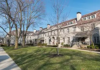 The complex forms a rough U-shape, with most units facing west toward Brunson Avenue; some units open to the north and south sides. The east side of the block is primarily lawn and porch space for the units. The building has 2.5 stories, with stuccoed brick exterior walls and a colorful roof of red, green, and gray slate.[1]