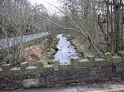 The geography of Broadclough is central to the development of the settlement. It is a three-sided valley which is cut through at the northeast end by the River Irwell which runs the length of Broadclough.[48] There is a trig point on the summit of Brex Height above Broadclough which marks the extent of the village's hinterland to the west.[49] The Trig Point pillar built in May 1948 and was last maintained by the OS in October 1979.[50] Brex Height is also the 12th highest summit in the West Pennines at 409 m (1342 ft).[51]