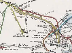 The site evolved around the Broadstone railway station to serve the requirements of the MGWR and also incorporated a steam servicing depot. By 1920 the site had reached its full extent. A set of buildings to the north of the station and the west of the main line housed locomotive, boiler, carriage, machine and paint shops. A locomotive semi roundhouse and large turntable lay to the east of the station and a locomotive shed to the north of that. These were for day to day servicing of steam locomotives. To the south of the station accessed by a line passing by the locomotive sheds and over a filled in dock of the Royal Canal lay the wagon build and repair shops.[7]