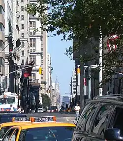 In spring 2017, as part of a capital reconstruction of Worth Square, Broadway between 24th and 25th Streets was converted to a shared street, where through vehicles are banned and delivery vehicles are restricted to 5 miles per hour (8.0 km/h). Delivery vehicles go northbound from Fifth Avenue to 25th Street for that one block, reversing the direction of traffic and preventing vehicles from going south on Broadway south of 25th Street. The capital project expands on a 2008 initiative where part of the intersection of Broadway and Fifth Avenue was repurposed into a public plaza, simplifying that intersection.[29] As part of the 2017 project, Worth Square was expanded, converting the adjoining block of Broadway into a "shared street".[30]