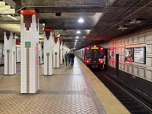 In the mid-1980s, the MBTA spent $80 million to extend the platforms of seven underground Red Line stations and three Orange Line stations to allow the use of six-car trains.[11] Contracts for Broadway and three other stations were awarded on December 18, 1985, with a groundbreaking held on February 13, 1986.[12][13] The Broadway work cost $7.9 million, with the platform extended by 70 feet (21 m).[13] Six-car trains entered service on January 21, 1988.[9] A new entrance east of Dorchester Avenue opened on February 16, 1988, and the project was completed on October 26, 1989.[12] Elevators were installed during the project, making Broadway one of the first older stations on the system to be modified for accessibility.[14][13]