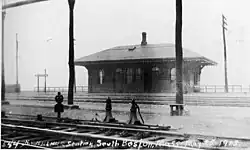 The Old Colony Railroad was built along the west edge of South Boston next to the Bass River in 1845. South Boston station was opened just south of the Dover Street (West 4th Street) bridge by the late 1860s.[2][3][4] The New York and New England Railroad (NY&NE) had its own South Boston station on the Midland Branch, located at West 1st Street near B Street. In use around the 1880s, it was closed no later than 1896, when Midland Branch service was rerouted to the Old Colony terminal during construction of South Station.[5][6]