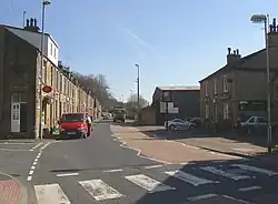 Central to the village is a small green set back from the A616 behind terraced housing, and overlooked by a church, a chapel and the village hall, formerly the village school. The village hall on Brockholes Lane was built in 1837 and is a Grade II listed building.[2] Further Grade II structures are the Gothic Revival St George's Church of England parish church, built in 1861,[3] the 17th- or early 18th-century Bank End farmhouse and barn on Bank End Knoll at the south-east of the village,[4][5] and a late 18th- to early 19th-century single-span bridge over the River Holme on Smithy Place Lane.[6]
