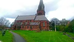 The partially medieval Bromborough Cross, in the old village centre, is a designated Grade II* listed building.[14] St Barnabas' Church, designed by George Gilbert Scott, is also Grade II* listed and was constructed in the 1860s to replace a smaller church.[15] Both Stanhope House and Pear Tree Cottage are Grade II listed and are amongst several buildings from the late seventeenth century that survive in the modern town.[16][17]
