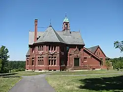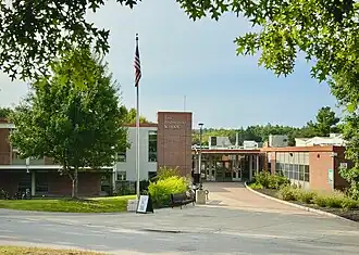 The old Bromfield school was built in 1878 by Peabody and Stearns, a well-renowned architecture firm based in Boston. By the early 1960s, the old building was getting too small for the town's rapidly growing population, only being able to accommodate around 100 students schoolwide.[12] In 1962, the current building and gymnasium were constructed to mitigate this issue. In 1989, the school built a new auditorium (named after town moderator John Cronin), a new parking lot behind the old building, band room, and hallway connecting the main building to the gymnasium. A 2003 expansion saw the construction of the south wing of the school, as well as a new library. Classes were held in the old building until this expansion.[13] Shortly after classes stopped being held in the old building, it began to be converted into the town's new library - as the old one was slowly reaching capacity. A large expansion was added to the old school building in 2007 and opened shortly after as the new Harvard Public Library.[14] The new building was partially renovated from 2022-2024, involving updates to locker rooms, bathrooms, and flooring. This renovation also included the unpopular decision to paint over a large mural in a stairwell which had been there since 2003.