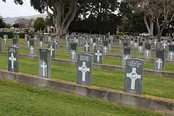 The cemetery has two rows of Royal New Zealand Returned and Services' Association (RSA) interments, and the Commonwealth War Graves Commission (CWGC) has records of 109 burials at Bromley, 15 from World War I and 94 from World War II.[2] In addition, the CWGC commemorates 33 Commonwealth service personnel cremated at Bromley Crematorium during World War II.[3] On the eve of Anzac Day 2008, over 160 headstones of veterans were painted over for maintenance to improve the inscriptions, which received criticism from visitors and the RSA due to the timing.[4]