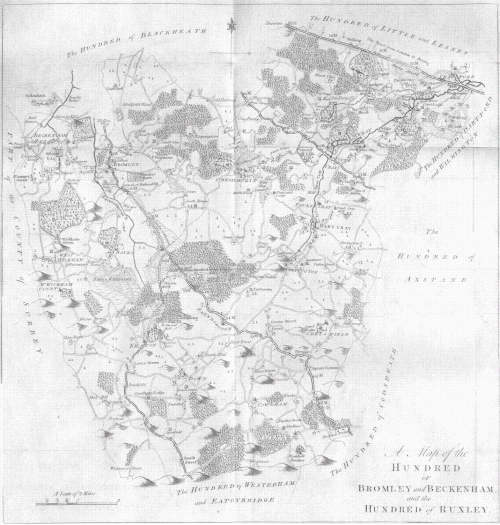 Map published in 1797 showing the hundred of Bromley and Beckenhamwith the hundred of Ruxley. | |
