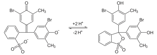 Similar to bromocresol green, the structure of bromocresol purple changes with pH. Changing the level of acidity causes a shift in the equilibrium between two different structures that have different colors. In near-neutral or alkaline solution, the chemical has a sulfonate structure that gives the solution a purple color. As the pH decreases, it converts to a sultone (cyclic sulfonic ester) that colors the solution yellow. In some microbiology tests, this change is used as an indicator of bacterial growth.[9][10]