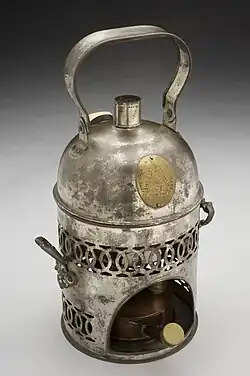 The bronchitis kettle, typified by a long spout, was used in the nineteenth and twentieth centuries to moisten the air for a sufferer of bronchitis, and was considered to make it easier to breathe for the patient. Sometimes menthol was added to the water to relieve congestion. The water was boiled on the fireplace in the room, or above a spirit lamp,[1] or, in the twentieth century, by electricity.[2] Sometimes the kettle was boiled within a tent placed around the patient.[3]