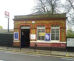 ![]() One of the small station buildings of Brondesbury Park Station, higher than the line which is in a cutting. It has small cornices at the hood of window height and a modillioned bulky cornice (ledge) above. It has a built in yellow-brown brick with complementary coloured red brick dressings. | |