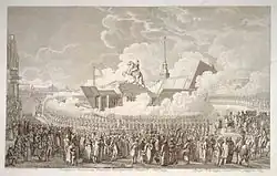 On 7 August 1782, fourteen years after excavation of the pedestal began, the finished statue was unveiled in a ceremony with thousands in attendance. Conspicuously absent was Falconet, as a misunderstanding between him and the empress turned into a serious conflict. As a result, he was forced to leave Russia four years before the project was completed. Catherine largely forgot about him afterwards, and came to see the Bronze Horseman as her own oeuvre.[3]