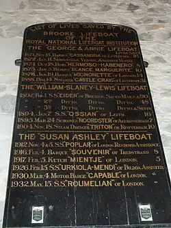 The last lifeboat on station at Brooke was the 35-foot Self-righting (P&S) lifeboat Susan Ashley (ON 579), placed on station on the 5 September 1907. On the night of 3 February 1916, the Norwegian barque Souvenir was bound for Lisbon, when she ran aground on the Great Stag Ledge, east of Brook Chine, about 1 nautical mile (1.9 km) off shore. Spotted at daybreak, the Brooke lifeboat was launched into terrible conditions. Unable to get alongside, the crew had no option but to jump into the sea, and hope to be rescued by the lifeboat. Eight of the 10 men were rescued, but the Captain was lost, and one man died in the lifeboat of exposure. Coxswain Benjamin Jacobs, himself once washed overboard from the lifeboat in 1888, was awarded the RNLI Silver Medal.[12]