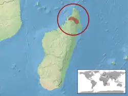 B. betschi is found in forests of northern Madagascar at altitudes of 1,150 to 1,650 m (3,770 to 5,410 ft).[1] It is found in subhumid forests in the Manongarivo Reserve,[7] the Anjanaharibe-Sud Reserve,[8] Marojejy National Park and the Tsaratanana Reserve, as well as in forests between them, over a total area of 11,090 km2 (4,280 sq mi).