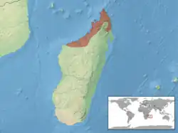 Glaw and Vences found B. stumpffi on small islands of Madagascar away from the main land mass of the country in 2007.[1] The species can only be found in certain parts of Madagascar; it can be found in Nosy Be (sometimes known as Nosy Bé), north-western Madagascar, Nosy Komba, and Nosy Sakatia,[2] and is common in the rainforest. Brookesia stumpffi can be found up to a height of 150 metres (490 feet) above sea level, and can be found over an area of 61,884 kilometres (38,453 miles).[1][4]