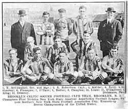 The Brooklyn Celtic, also known as the Brooklyn Celtics and Celtic F.C., was an early twentieth century American soccer team which competed in the New York Amateur Association Football League. They won the second division in 1910–11, gaining promotion to the first division.[1] They proved their worth as a first division team in the 1911–12 season when they tied New York Clan MacDonald for second place. The two teams met in a playoff for sole position of second, with Clan MacDonald winning 1–0.[2] The next season, Celtic went on a streak of five straight league championships. Celtic was the runner-up in the first National Challenge Cup in 1914.[3] The following year, Celtic was the runner-up for both the American Cup[4] and the Challenge Cup.[5]