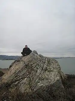 The rock that forms the main peak of the island is radiolarian chert underlain by limestone and graywacke sandstone. All these rocks are part of the Franciscan Assemblage, the same range as Albany Hill, 3 miles south, and the Coyote Hills, 25 miles south in Hayward.[2] This Franciscan formation is derived from sediments laid down in the sea west of San Francisco during the Late Jurassic and Cretaceous (150-66 million years ago) and then scraped off onto the edge of the North American Plate during the subduction of the Farallon Plate.[2][8] The main portion of the island covers an area of approximately 47 acres (19 ha), with the tidal lands along the breakwater covering approximately 30 acres (12 ha) more.[1][14]