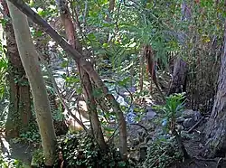 A minor tributary of Ballona Creek, known as El Rio del Jardin de las Flores, runs through Brookside.[1][3] “The stream originates in the Hollywood Hills and wanders from one side of Longwood Avenue to the other.”[3]