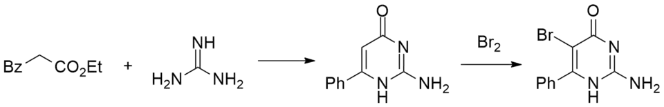 For the first step, the dianion from malonic acid half-ester is formed by treatment with butyllithium. Acylation of the anion with benzoyl chloride proceeds at the carbanion, which is more nucleophilic (because of the higher charge density). This tricarbonyl compound decarboxylates on acidification to the β-ketoester. Condensation with guanidine leads to the pyrimidone. NBS mediated bromination then gives bropirimine.