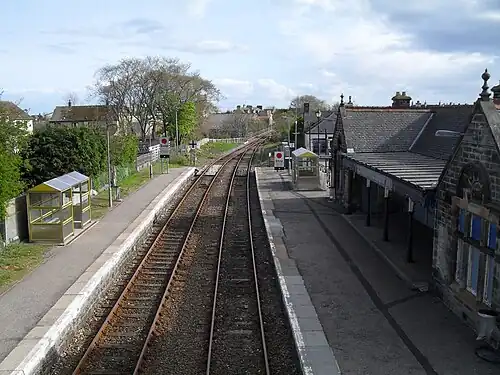 Brora railway station (/ˈbrɔːrə/) is a railway station serving the small town of Brora in the Highland council area of Scotland. The station is on the Far North Line, 90 miles 48 chains (145.8 km) from Inverness, between Dunrobin Castle and Helmsdale.[5] ScotRail, who manage the station, operate all services.