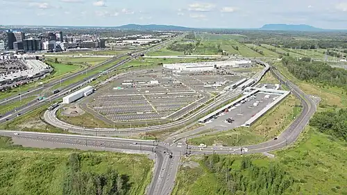 The station is equipped with a large regional bus terminal for Exo buses, as well as 2,948-space parking lot. The station is adjacent to the operations and maintenance centre for the REM. It is accessible via de Rome Boulevard. The station opened on 31 July 2023.[5] With the opening of Brossard in 2023, the long-time park and ride lot Brossard-Chevrier, located on the opposite side of the Autoroute 10/30 interchange, closed.[6]