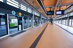 Brossard (French: [bʁɔsaʁ], locally [bʁɔsɑːʁ, bʁɔsɑɔ̯ʁ]; known as Rive-Sud during early development) is a Réseau express métropolitain (REM) station in the city of Brossard, Quebec, Canada. Located approximately 200 metres (660 ft) south of the intersection of Autoroutes 10 and 30, in the uninhabited Y section of Brossard, the station is the only elevated station on the South Shore segment and is operated by CDPQ Infra; it serves as the southern terminus of the REM and the eastern-most subway stop in Canada.[4]