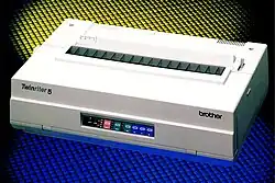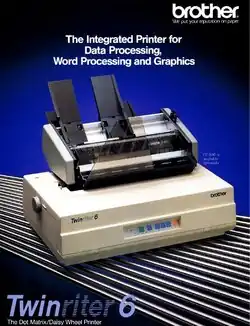 The Twinriter is a series of impact computer printers released by Brother Industries starting in 1985. The Twinriter has a unique hybrid printing system, combining a daisy wheel, for producing letter-quality text, and a dot matrix printhead, for producing graphics and other symbols not present on the daisy wheel. Brother released only two printers in the Twinriter series: the Twinriter 5 in 1985 and the Twinriter 6 in 1987. Sales of the Twinriter did not meet Brother's projections, and by 1990 the family of printers was discontinued.