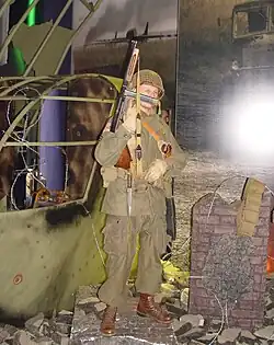 The game features a cover system, which allows players to strategically hide behind objects while fighting enemies, and alternates the player's view to an over the shoulder perspective, similar to a third-person shooter.[4] Hell's Highway features a destructible cover system, allowing objects such as wooden fences and sandbags to be destroyed by gunfire or explosives.[4][5] Unlike the previous entries in the series, a regenerating health system is present, justified as representing a character's exposure to "threat" rather than resilience to damage: when the player's character is exposed to enemy fire, the screen turns red and blurry. If he remains under fire, he will eventually be hit and killed. Remaining safe from enemy fire will quickly remove "threat".[4] Gameplay also introduces the "action camera" feature which sometimes momentarily slows down time when a player kills an enemy with a headshot or grenade.[4]