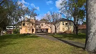 It is set in generous grounds with large trees giving shade and privacy.[19] Despite the reduction in extent of its grounds and later building infill and encroachment, some remnant plantings give an idea of the grandeur of the former Newlands/Broughton Hall/House in its heyday. One mature and very tall Californian desert fan palm (Washingtonia robusta) and mature shrubs including Cotoneaster sp. and African olive (Olea europaea var. cuspidata) are near the house. Large trees include two silky oaks (Grevillea robusta), a large lemon-scented gum (Corymbia citriodora), Chinese elm (Ulmus parvifolia), paperbark (Melaleuca quinquenervia), golden Monterey cypress (Cupressus macrocarpa "Aurea Stricta", English oak (Quercus robur), Manchurian pear (Pyrus ussuriensis), bottlebrush (Callistemon, likely C. salignus) and jacaranda (Jacaranda mimosifolia).[1]