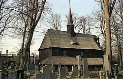 Besides the monastery church, there are four other significant churches in the town. The rarest is the wooden Church of the Virgin Mary, which is a national cultural monument.[21] This cemetery church was founded at the latest in the early 13th century. It was rebuilt in 1450[22] or 1459[20] after it was burnt down by the Hussites, and repaired in 1779. It is one of the oldest wooden sacral buildings in central Europe. The church is exceptional not only for its age, but also for its construction technique. It does not contain any nails and is formed by half-timbered structure made of massive oak beams. It includes a gallery with Renaissance and Empire tombstones.[22][20]
