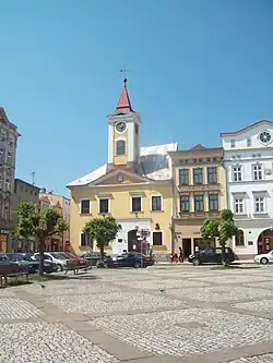 Broumov has preserved historical centre similar to Silesian towns with a large rectangular market square with two parallel main streets running from both sides of the square and converging at both gates located on the opposite sides of the town.[12] Throughout the perimeter of the old town are preserved fragments of town walls. The town hall on the square was originally from the 13th century and one of the oldest in Bohemia. Its current appearance is a result of many reconstructions, the last are from 1839 and 1994. In the historic centre there are many valuable burghers' houses, originally in the Gothic style and rebuilt in 16th, 18th and 19th centuries.[20]