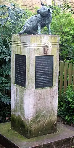 After the trial Anna Louisa Woodward, founder of the World League Against Vivisection, raised £120 for a public memorial and commissioned a bronze statue of the dog from sculptor Joseph Whitehead. The statue sat on top of a granite memorial stone, 7 ft 6 in (2.29 m) tall, that housed a drinking fountain for human beings and a lower trough for dogs and horses.[66] It also carried an inscription (right), described by The New York Times in 1910 as the "hysterical language customary of anti-vivisectionists" and "a slander on the whole medical profession".[51]