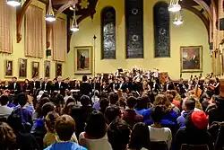 The Brown University Orchestra (BUO) was founded in 1918 and is composed of approximately 100 members of the Brown University community. It was led by conductor Martin J. Fischer at its inception, until his faculty retirement. Paul Phillips led the orchestra from 1989 until 2017,[1] with Mark Seto currently serving as conductor.[2][3]