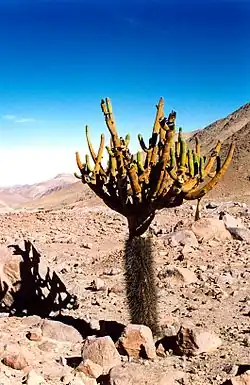 Browningia candelaris is a species of cactus from northern Chile and southern Peru. It has a distinctive growth habit, with a straight spiny trunk topped by more-or-less spineless thinner branches. In some places, the long-term survival of local populations may be threatened by grazing, which destroys seedlings.[2]