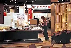 Philips Competence Center, Eindhoven, the Netherlands (1991).[37]Philips Competence Center, The NetherlandsThe Evoluon, a large concrete flying saucer, was repurposed from a threadbare science museum to a corporate "front door." From an article in Design Management Journal by Bruce and Susan Burdick: "In its recent corporate restructuring, Philips had combined some divisions, eliminated others, and, in the process, downsized. One of the ways it had done this was to identify its core competencies . . . A major part of the work of the front door would be to illustrate how these various competencies come together to produce new and significant product innovations."[38] The exhibit's circular layout emphasized its random access character. Burdick told The Architectural Record, "Exhibits aren't like books, which you read from front to back. People move through them at their own pace and along a number of different paths."[39]