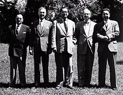 Left to right: unidentified, Bruce Metzger, Kurt Aland (center), Allen Wikgren, Matthew Black