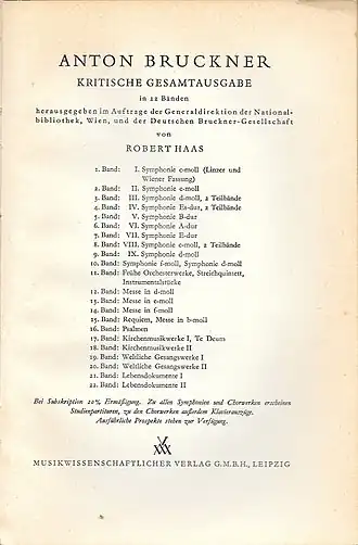 - Volume 1: Symphony No. 1, (revised) "Linz version" and "Vienna version", edited by Robert Haas, 1935