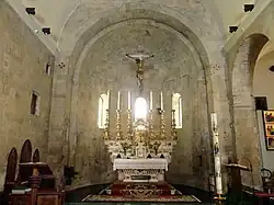 There are differences between the two naves: the central and larger one is covered by barrel vaulting and ends in a semicircular apse with three single-light windows; the smaller side nave to the south however has bays of groin vaulting and terminates in a square wall inside within an external curved apse.