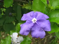 Brunfelsia latifolia, commonly known as yesterday-today-tomorrow and kiss me quick, is a species of flowering plant in the nightshade family. Endemic to Brazil,[1] it is an evergreen shrub that becomes semi-deciduous in cooler areas and grows up to 1.8 meters (6 feet) in height.