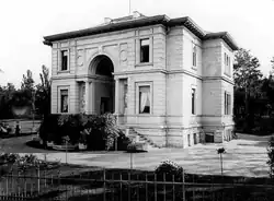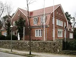 Ahrends left civil services to establish himself as an architect in Germany's capital, where the design of housing estates and single homes were a prosperous and prestigious business. In 1911-12 his first self-contained project was his own family's home, a cottage in the borough Dahlem, today used as villa of the President of the German parliament. He even planned its amply backyard which was sited in 1914.[5] In 1917 he sold the cottage to a Berlin banker. After World War II it was used for the US legate in West-Berlin until 1991. Since about 1996 it is the service villa of the President of the German parliament Bundestag. Differently from that, between 1999 and 2004 the estate was used by the President of Germany, Johannes Rau and his family.[6][7][8]