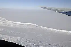 In 2012, previously stable large chasms in the ice shelf (cracks which clearly go all the way through to the sea) started expanding,[2] which was expected to cause large parts of the Brunt Ice Shelf to break off within the next few years.[3] On 26 February 2021, the 1,270 km2 (490 sq mi) Iceberg A-74 duly broke away from the north-facing shelf, separating from the edge of the shelf at the McDonald Ice Rumples along the North Rift and finally joining the Brunt-Stancomb chasm. As of 28 February, A-74 was located at 75° 13' South, 25° 41' West and measures 30 nautical miles (56 km) on its longest axis and 18 nautical miles (33 km) on its widest axis.[4][5]