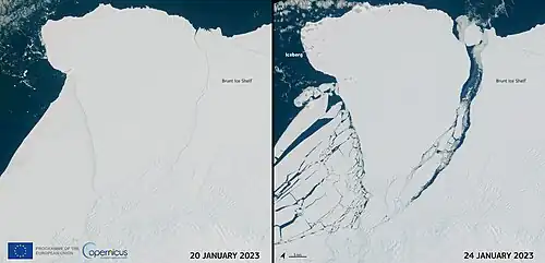 - ^ "Brunt Ice Shelf in Antarctica calves giant iceberg". British Antarctic Survey. 23 January 2023.