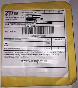 - ^ Shepard, Wade. "Americans Are Receiving Unordered Parcels From Chinese E-Criminals – And Can't Do Anything To Stop Them". Forbes. Archived from the original on 6 May 2018. Retrieved 6 May 2018.
