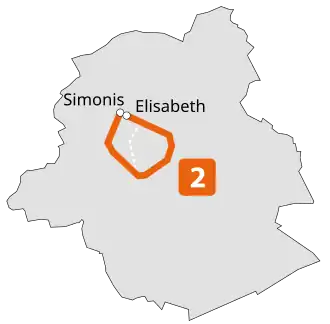 Line 2 is a rapid transit line on the Brussels Metro in Belgium operated by STIB/MIVB. It has existed in its current form since 4 April 2009, when the section between Delacroix and Gare de l'Ouest/Weststation was opened, which allowed to close the "loop" from and to Simonis/Elisabeth. The configuration of Simonis/Elisabeth though does not allow trains on line 2 to perform the loop several consecutive times in the same direction, i.e. a train running clockwise from Elisabeth will have to run counterclockwise from Simonis. The two termini of line 2 have thus received different names: originally Simonis (Elisabeth) and Simonis (Leopold II), changed in November 2013 to Elisabeth and Simonis. Between Yser/IJzer and the Porte de Hal/Hallepoort, the line runs under the Small Ring (Brussels' inner ring road), which was itself built on the site of the former second walls of Brussels. The line crosses the municipalities of Koekelberg, Molenbeek-Saint-Jean, City of Brussels, Saint-Gilles and Anderlecht.