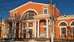 The unique architectural silhouette of the city, which was formed by the beginning of the 19th century, was skilfully expanded and enlarged by the end of the century. In the center, on the territory of the Spaso-Polikarpov Monastery, the Novopokrovsky Cathedral was erected (1862–1897), which emphasized the planning center of the district town with its scale. On the right flank there was a building of a trade and craft school, built by the architect N. A. Lebedev, which linked the building of the Arsenal plant and the Tikhvin church into a single chain of historical buildings.[24]