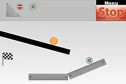 In each level of the game, the player is provided a different set of movable items ranging from basic shapes to power-ups that can speed the ball or reverse gravity. The screen also starts with a configuration of the same types of items and fixed walls that cannot be repositioned by the player. After positioning the movable items, the user presses the start button, and the movement of the items on the screen is simulated based on the laws of physics. The user has no further input after the start button is pressed, but can stop the simulation to reposition items as many times as necessary to find a configuration in which the ball eventually reaches the goal. The basic shapes include "metal" objects that stay fixed in position once the action starts, and wood objects that move in response to gravity or collisions with other objects. Moveable objects can be rotated as well as shifted in position.