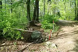 In the course of these processes profound joints were created that made the development of caves and sinkholes possible.[5] Following the miocene karstification, the ridge was buried under loose sediments. The removal of these sediments during the Riss/Würm interglacial period happened asymmetrical because of the mighty down-cutting of the Mur river. As a result, the eastern slope of the Buchkogel shows a concave profile. On the western side a blind valley with numerous sinkholes and little poljes was formed. The sparse creeks run through a ponor into the mountain and emerge from the Eisbründlhöhle, a small cave about 70 meters below on the eastern foot of the hill.[5][6] At that sea level the Devonian rocks meet the loamy and thus water-damming sediments of the Riss terrace.[7] The subsurface connection at the narrowest part of the hill ridge could be scientifically verified in the 1950s via dye tracing.[8] This means that the hill has its own closed karst water system which is not connected to the Mur valley's groundwater body.[5]