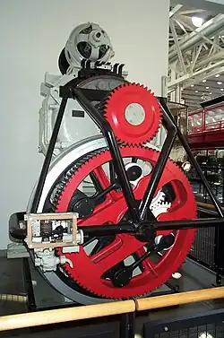 The driving wheel is coupled with two gear wheels, and the motor has a pinion on both sides.[2] The taps in the wheel disk are warped about 90 degrees against each other so that the drive imbalance can be reduced. This version of the driver was used for greater driving power.