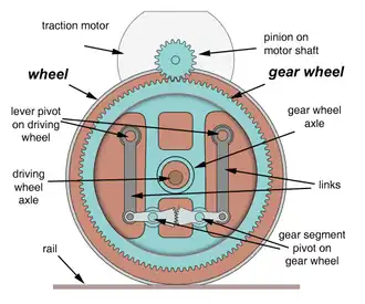 In a Buchli drive a driven gear wheel is securely fixed to the locomotive frame. Inside this gear wheel are two levers, coupled to gear segments that mesh with one another. The other end of the levers is coupled via universal joints to tension bars, which are then coupled via more universal joints to the driving rail wheel.[1]