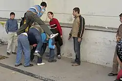 In Turkey, a similar game is uzun eşek ("long donkey").[12][13] The person standing up is the referee and is called the "pillow". One team bends over, then the other team one by one jumps on the "donkey". If the Donkey can stand the pressure, the first person to go in the jumping team puts up one or two with his fingers. If the donkey can guess the number right, they are permitted to jump. If the jumpers fall to the ground, it is the donkey's turn to jump. If the donkey falls, the jumpers jump again.